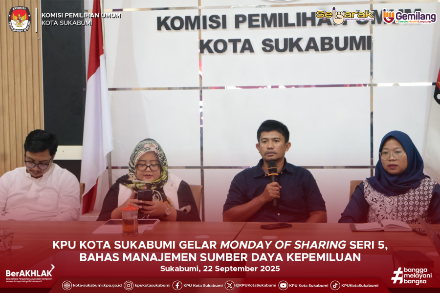 Sukabumi – Komisi Pemilihan Umum (KPU) Kota Sukabumi kembali melaksanakan agenda rutin Monday of Sharing (MOS) pasca tahapan Pemilu/Pemilihan. Pada Senin, 22 September 2025, MOS Seri ke-5 hadir dengan tema Manajemen Sumber Daya Kepemiluan dalam Penyelenggaraan Pemilu dan Pilkada.