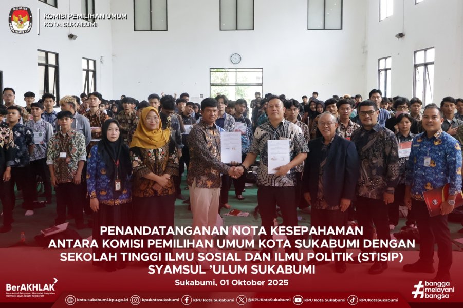 Sukabumi, 1 Oktober 2025 – Komisi Pemilihan Umum (KPU) Kota Sukabumi resmi menjalin kerja sama dengan Sekolah Tinggi Ilmu Sosial dan Ilmu Politik (STISIP) Syamsul ’Ulum Sukabumi melalui penandatanganan Nota Kesepahaman (MoU) yang berlangsung di Aula Kampus STISIP Syamsul ’Ulum, Rabu (1/10/2025).
