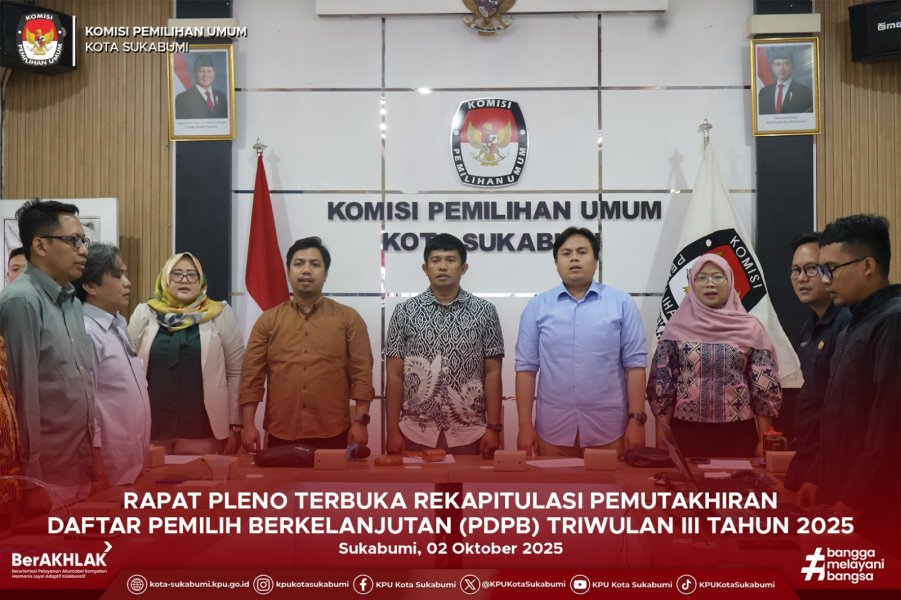 Sukabumi, 2 Oktober 2025 — Komisi Pemilihan Umum (KPU) Kota Sukabumi melaksanakan Rapat Pleno Terbuka Rekapitulasi Pemutakhiran Daftar Pemilih Berkelanjutan (PDPB) Triwulan III Tahun 2025 pada Kamis (02/10/2025) bertempat di Kantor KPU Kota Sukabumi.