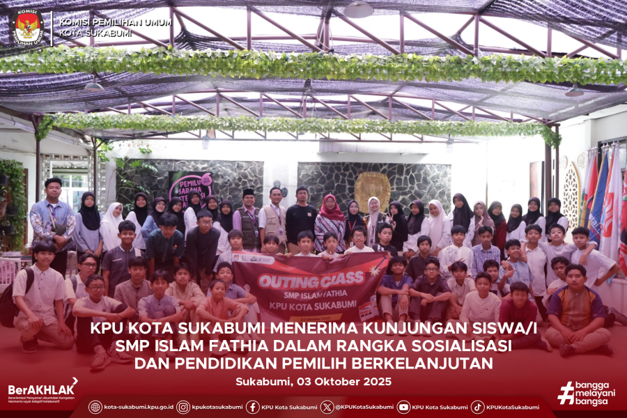 Sukabumi, Jumat 3 Oktober 2025 - Komisi Pemilihan Umum (KPU) Kota Sukabumi kembali melaksanakan kegiatan Sosialisasi dan Pendidikan Pemilih Berkelanjutan, kali ini bersama para siswa dan siswi SMP Islam Fathia Sukabumi. Kegiatan ini berlangsung pada Jumat, 3 Oktober 2025 di ruang pertemuan KPU Kota Sukabumi dan bertujuan untuk menanamkan sejak dini pemahaman tentang demokrasi dan pentingnya partisipasi dalam pemilu.