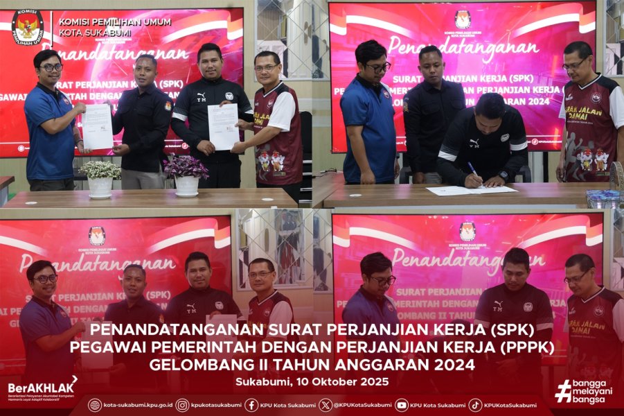 Sukabumi, Jumat 10 Oktober 2025 – Komisi Pemilihan Umum (KPU) Kota Sukabumi melaksanakan kegiatan Penandatanganan Surat Perjanjian Kerja (SPK) Pegawai Pemerintah dengan Perjanjian Kerja (PPPK) Gelombang II Tahun Anggaran 2024.