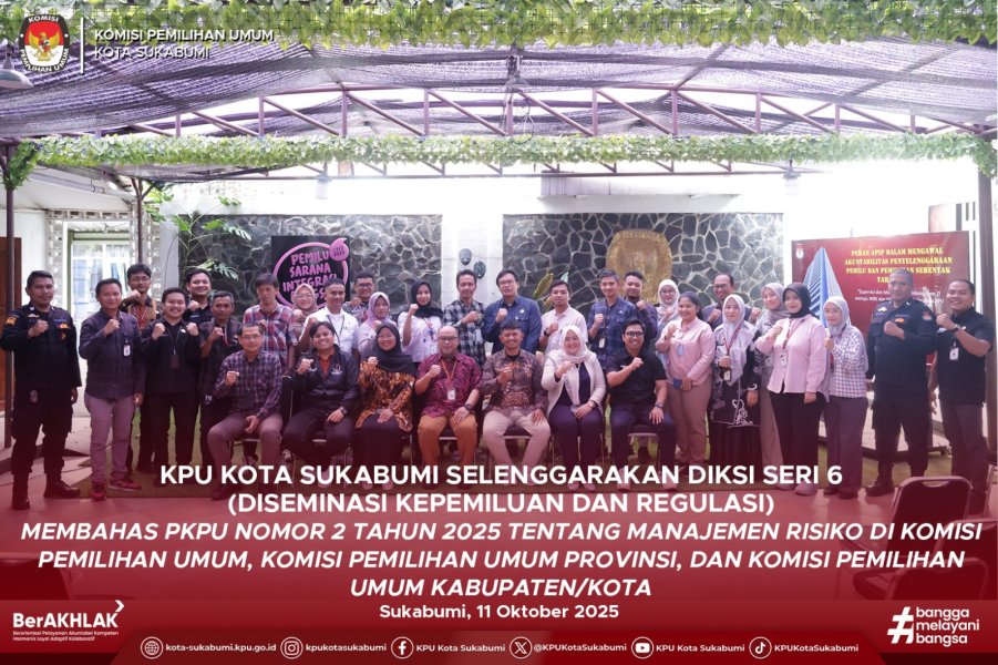 Sukabumi, 11 Oktober 2025 – Komisi Pemilihan Umum (KPU) Kota Sukabumi kembali menyelenggarakan kegiatan DIKSI Seri 6 (Diseminasi Kepemiluan dan Regulasi) dengan tema “Pembahasan PKPU Nomor 2 Tahun 2025 tentang Manajemen Risiko di Komisi Pemilihan Umum, Komisi Pemilihan Umum Provinsi, dan Komisi Pemilihan Umum Kabupaten/Kota.”
