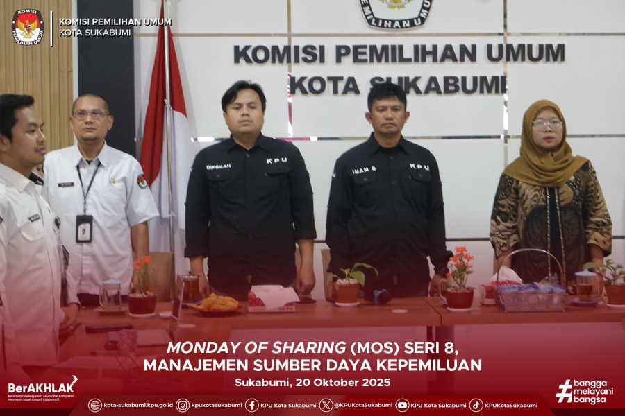 Sukabumi, 20 Oktober 2025 - Komisi Pemilihan Umum (KPU) Kota Sukabumi kembali menggelar kegiatan Monday Of Sharing (MOS) seri ke-8 bertempat di Ruang Pertemuan Kantor KPU Kota Sukabumi. Kegiatan rutin yang menjadi sarana pembelajaran internal ini dibuka secara resmi oleh Ketua KPU Kota Sukabumi, Imam Sutrisno.
