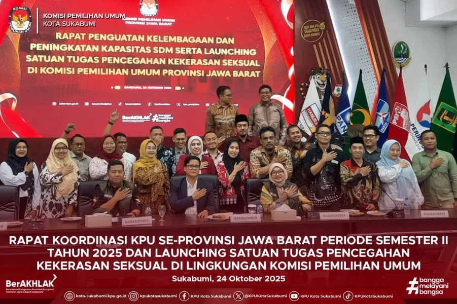 Bandung – 24 Oktober 2025 – Upaya peningkatan kualitas sumber daya manusia (SDM) dan penguatan kelembagaan di lingkungan Komisi Pemilihan Umum (KPU) terus digencarkan. KPU Provinsi Jawa Barat bersama Badan Kesatuan Bangsa dan Politik (Bakesbangpol) Jawa Barat terus mendorong penguatan SDM dan kelembagaan penyelenggara pemilu. Komitmen itu diwujudkan melalui Rapat Koordinasi KPU se-Jawa Barat Semester II Tahun 2025, yang dirangkai dengan Launching Satgas Pencegahan Kekerasan Seksual di Lingkungan KPU, Jumat (24/10), di Aula Setia Permana, Kota Bandung.