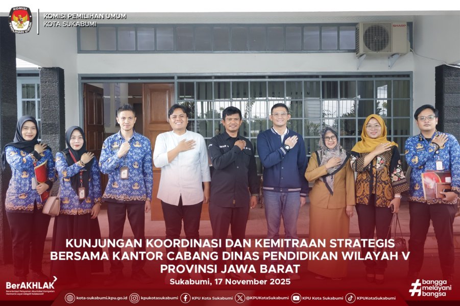 SUKABUMI, Senin 17 November 2025 – Komisi Pemilihan Umum (KPU) Kota Sukabumi melaksanakan kunjungan kerja dalam rangka memperkuat kemitraan strategis dengan Kantor Cabang Dinas (KCD) Pendidikan Wilayah V Provinsi Jawa Barat. Kunjungan ini merupakan bagian dari upaya tindak lanjut rencana perpanjangan kerja sama yang sebelumnya telah terjalin antara KPU Kota Sukabumi dan KCD Pendidikan, khususnya dalam program peningkatan partisipasi pemilih tingkat SMA/SMK/SLB melalui muatan pembelajaran Pemilu dan demokrasi.