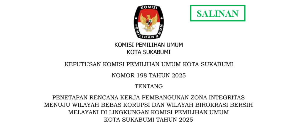 KPU Kota Sukabumi dengan komitmen tinggi melaksanakan Zona Integritas menuju Wilayah Bebas dari Korupsi (WBK) dan Wilayah Birokrasi Bersih dan Melayani (WBBM) sebagai suatu bagian dari agenda reformasi birokrasi yang diterapkan secara berkelanjutan di lingkungan penyelenggara pemilu. Komitmen tersebut menjadi suatu bentuk realisasi dari bentuk kebijakan yang ditegakkan oleh KPU Kota Sukabumi sebagai langkah konkret dalam rangka memperkuat tata kelola kelembagaan profesional, transparan, dan akuntabel.