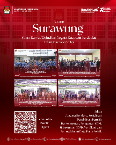 KPU Kota Sukabumi merilis Buletin Edisi Desember 2025 yang diberi nama Surawung (Suara Rakyat Wujudkan Negara Kuat dan Berdaulat). Edisi akhir tahun ini menyajikan beragam aktivitas yang menggambarkan semangat KPU Kota Sukabumi dalam menjaga nilai-nilai demokrasi. Mulai dari kegiatan internal, kolaborasi kelembagaan dengan instansi lain, hingga keterlibatan aktif dalam kegiatan sosial.