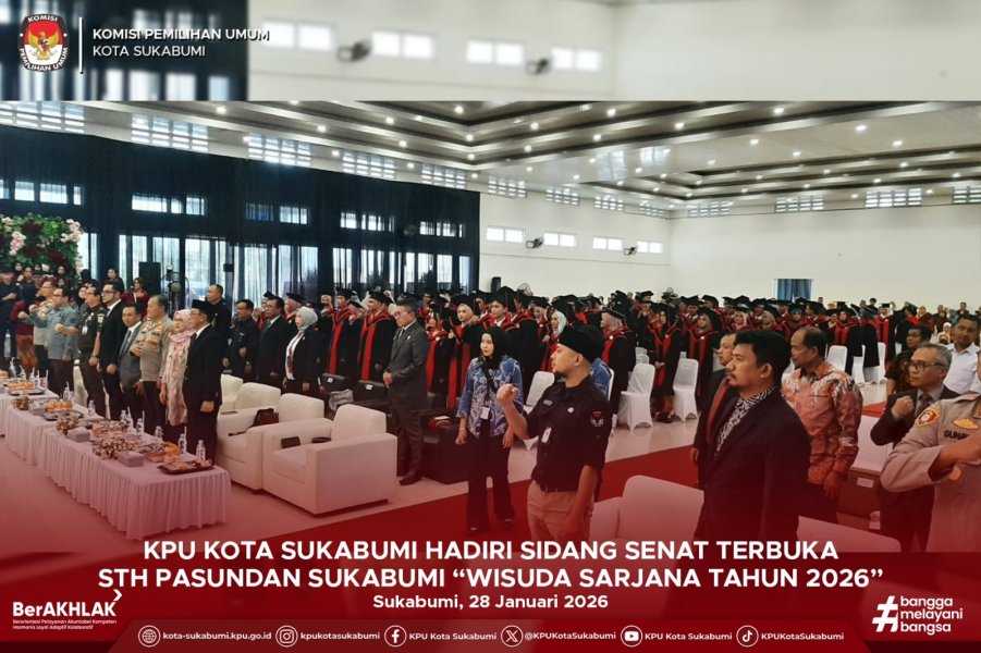 KOTA SUKABUMI — Komisi Pemilihan Umum (KPU) Kota Sukabumi menghadiri undangan Sidang Senat Terbuka Sekolah Tinggi Hukum (STH) Pasundan Sukabumi dalam rangka Wisuda Sarjana Tahun 2026 yang digelar di Gedung Harsa, Lingkar Selatan, Kota Sukabumi.