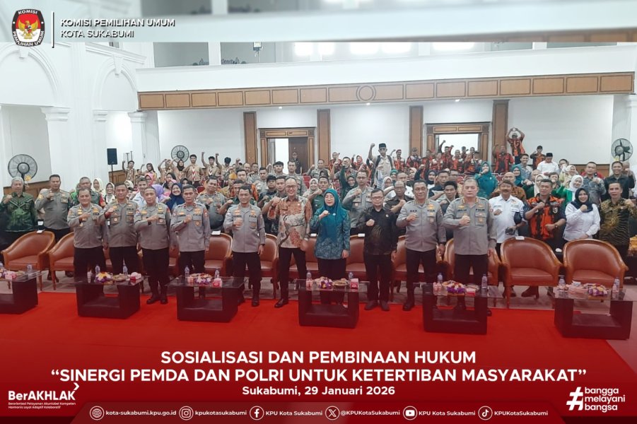 KOTA SUKABUMI — Komisi Pemilihan Umum (KPU) Kota Sukabumi menghadiri kegiatan Sosialisasi dan Pembinaan Hukum bertajuk “Sinergi Pemerintah Daerah dan Polri untuk Ketertiban Masyarakat” yang diselenggarakan oleh Pemerintah Daerah Kota Sukabumi. Kegiatan ini berlangsung di Gedung Juang 45 Kota Sukabumi.