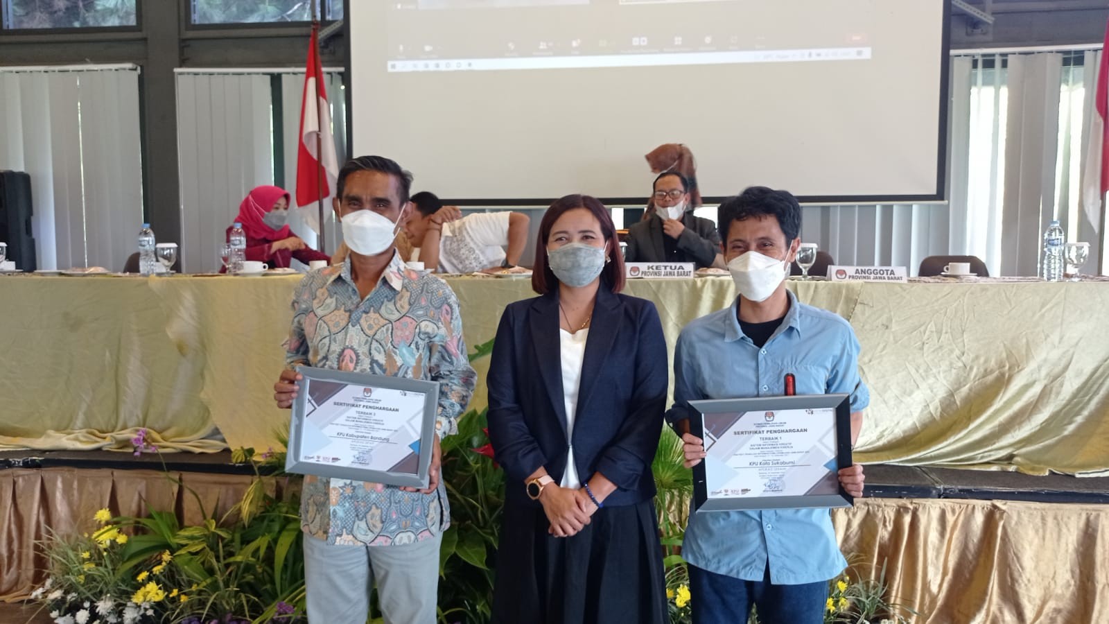 Piagam Penghargaan diberikan langsung oleh Rifqi Ali Mubarok (Ketua KPU Provinsi Jawa Barat) dan Titik Nurhayati (Anggota KPU Provinsi Jawa Barat) kepada Harlan Awaludin Kahar (Anggota KPU Kota Sukabumi) pada saat kegiatan Rapat Koordinasi Peningkatan Kualitas Data Pemilih Berkelanjutan (di The Green Forest Resort Bandung).