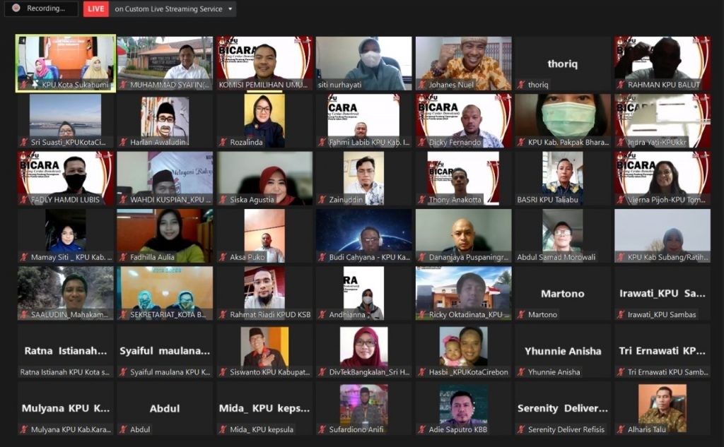 Webinar BICARA (Bincang Cerdas Demokrasi) seri ke-8 (delapan) di isi oleh 3 (tiga) orang narasumber yaitu Muhammad Syai’in, S.H., MH. (Ketua KPU Kabupaten Jember), Siti Nurhayati, S.H. (Divisi Hukum & Pengawasan KPU Kabupaten Magelang), dan Siska Agustia, S.Psi. (Divisi Hukum & Pengawasan KPU Kota Sukabumi). Adapun yang menjadi moderator pada webinar BICARA seri ke-8 ini yaitu Ratna Istianah (Divisi Sosialisasi, Pendidikan Pemilih Partisipasi Masyarakat dan SDM KPU Kota Sukabumi).