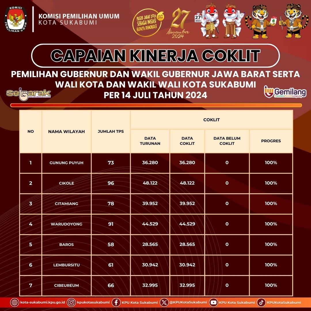 Berikut kami sampaikan Hasil Kinerja Coklit Pemilihan Gubernur dan Wakil Gubernur Jawa Barat serta Wali Kota dan Wakil Wali Kota Sukabumi Tahun 2024 pertanggal 14 Juli 2024.