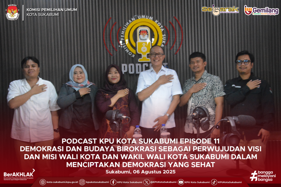 Sukabumi, 06 Agustus 2025 – Komisi Pemilihan Umum (KPU) Kota Sukabumi kembali menghadirkan inovasi edukasi politik melalui kegiatan podcast yang diselenggarakan pada Rabu, 6 Agustus 2025. Podcast kali ini mengangkat tema “Demokrasi dan Budaya Birokrasi sebagai Perwujudan Visi Misi Wali Kota dan Wakil Wali Kota Sukabumi dalam Upaya Membangun Demokrasi yang Sehat di Kota Sukabumi” dengan menghadirkan Wali Kota Sukabumi, H. Ayep Zaki, S.E., M.M. sebagai narasumber utama.