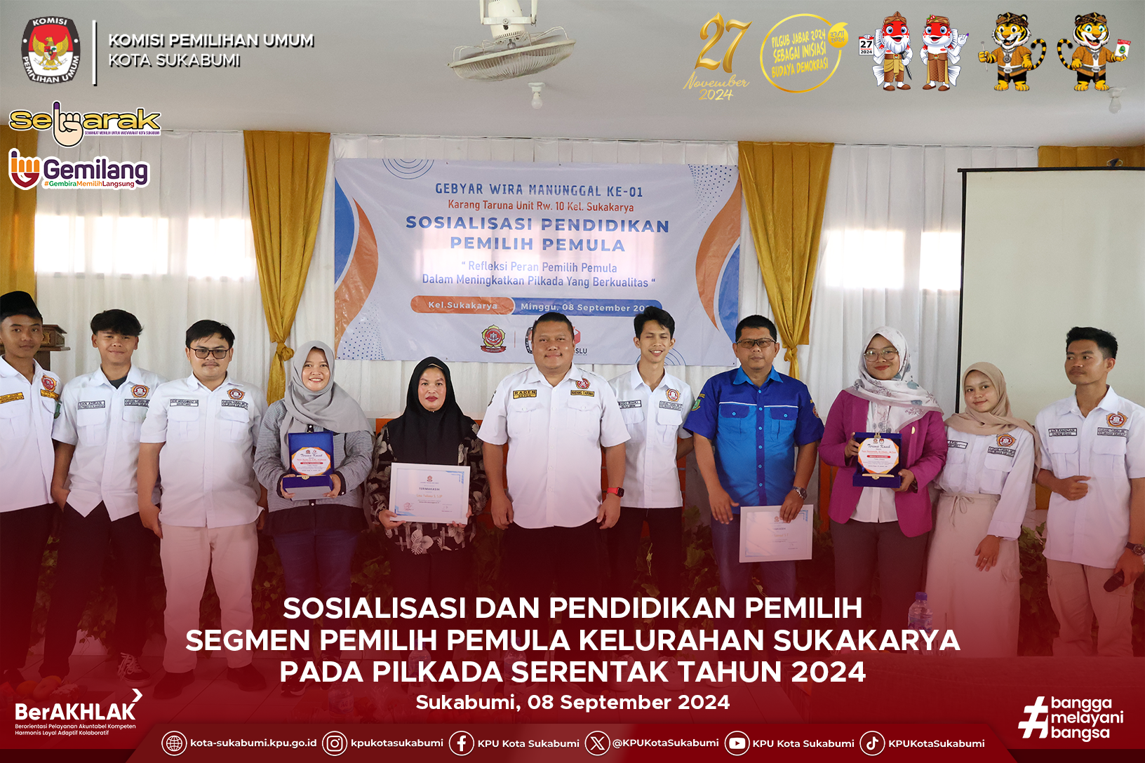 Sukabumi, 08 September 2024 – Komisi Pemilihan Umum (KPU) Kota Sukabumi terus menggencarkan upaya peningkatan partisipasi pemilih, khususnya di kalangan pemilih pemula. Bertempat di Aula Kelurahan Sukakarya, KPU Kota Sukabumi bersama Karang Taruna Ranting RW 10 menggelar kegiatan sosialisasi dan pendidikan pemilih yang diikuti pemilih pemula dari kelurahan Sukakarya.