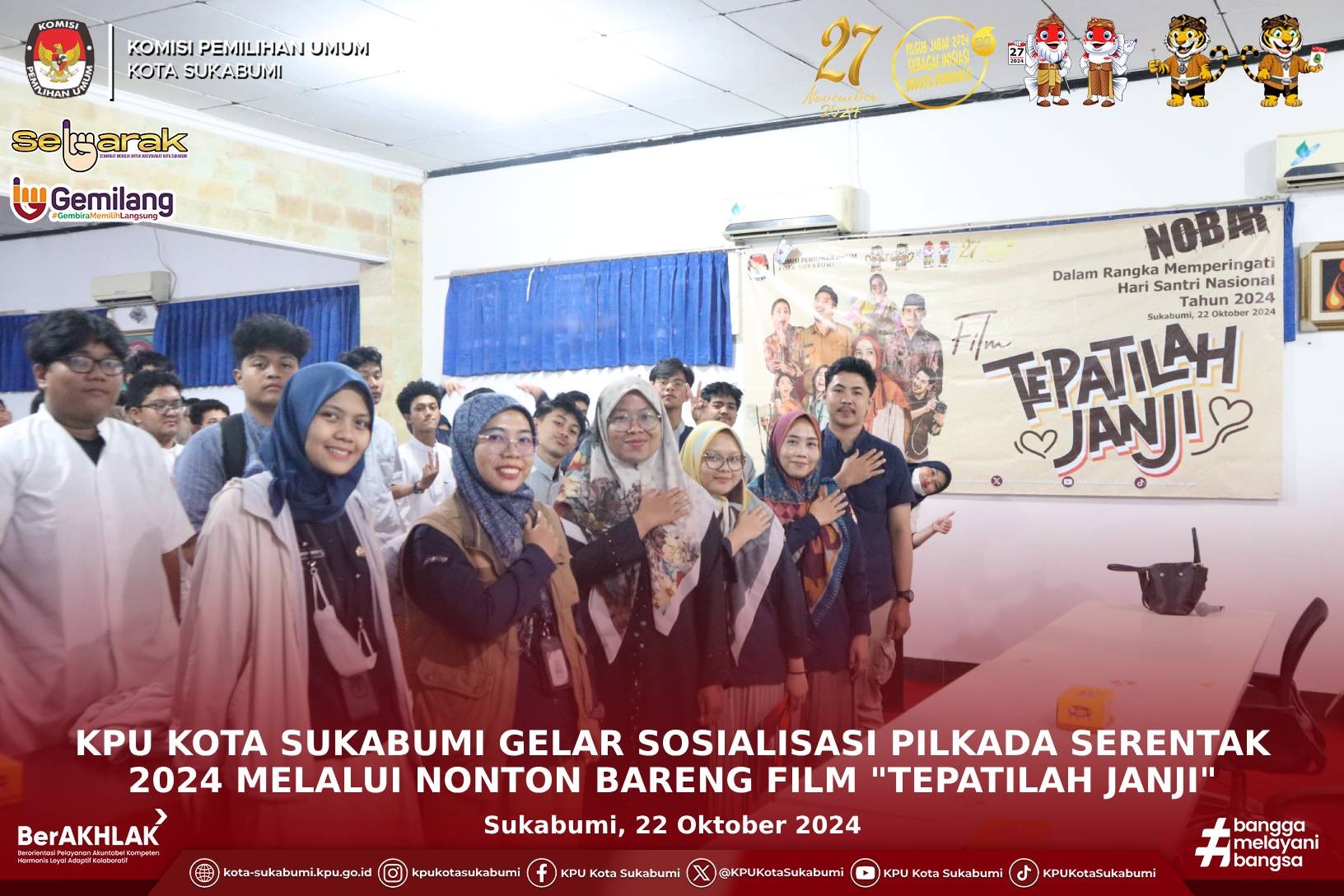 Sukabumi, 22 Oktober 2024 – Dalam rangka meningkatkan partisipasi pemilih pada Pemilihan Kepala Daerah (Pilkada) Serentak 2024, Komisi Pemilihan Umum (KPU) Kota Sukabumi menggelar kegiatan sosialisasi dengan metode nonton bareng (nobar) film berjudul Tepatilah Janji di Aula SMA Pesantren Terpadu Hayatan Thayyibah Sukabumi. Kegiatan ini dihadiri oleh para santri SMA Pesantren Terpadu Hayatan Thayyibah dan bertepatan dengan peringatan Hari Santri Nasional.
