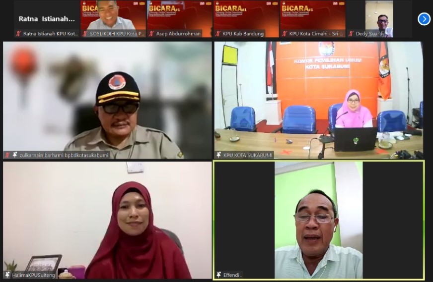 KPU Kota Sukabumi menghadirkan Halima, S.Ag (Ketua Divisi Perencanaan Data dan Informasi KPU Provinsi Sulawesi Tengah) dan Akhmad Zulkarnain, SE.,MM. (Kasi Pencegahan dan Kesiapsiagaan BPBD Kota Sukabumi) sebagai narasumber, Serta Dr. Risvirenol, S.S., M.Pd.(Ketua Divisi Sosialisasi, Pendidikan Pemilih,Partisipasi Masyarakat dan SDM KPU Kota Palu) sebagai pemantik. Dengan moderator Ratna Istianah, S.Si (Ketua Divisi Sosialisasi, Pendidikan Pemilih, Partisipasi Masyarakat dan SDM KPU Kota Sukabumi).