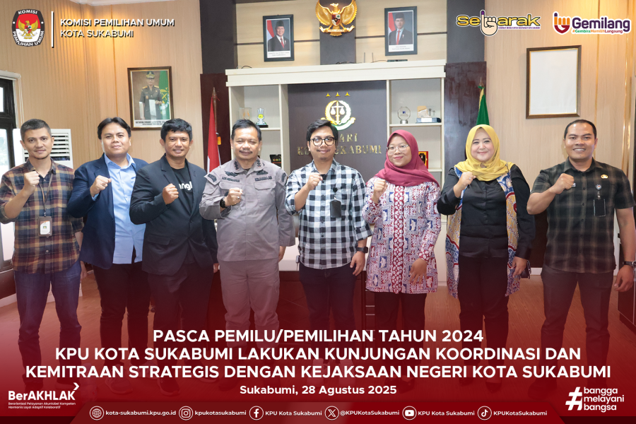 Sukabumi, 28 Agustus 2025 – Pasca penyelenggaraan Pemilu dan Pemilihan Tahun 2024, Komisi Pemilihan Umum (KPU) Kota Sukabumi terus memperkuat koordinasi serta menjalin kemitraan strategis dengan berbagai pihak. Pada Kamis (28/8), jajaran KPU Kota Sukabumi melakukan kunjungan ke Kejaksaan Negeri Kota Sukabumi bertempat di ruang pertemuan Kejaksaan Negeri.