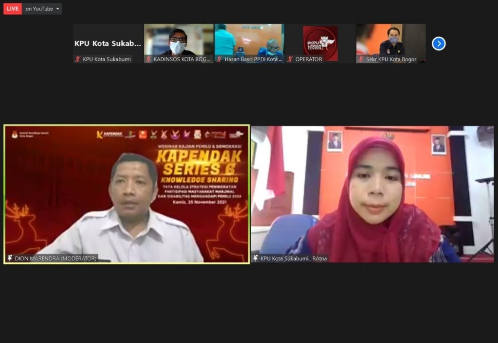 Sukabumi, 25/11/2021 – KPU Kota Sukabumi (Ratna Istianah/Ketua Divisi Sosialisasi, Pendidikan Pemilih, Partisipasi Masyarakat dan SDM) menjadi narasumber pada kegiatan Webinar Kajian Pemilu & Demokrasi (KAPENDAK) Series 6 yang diselenggarakan oleh KPU Kota Bogor dengan tema “Tata Kelola Strategi Peningkatan Partisipasi Masyarakat Marjinal dan Disabilitas Menghadapi Pemilu 2024”.Kegiatan webinar tersebut diselenggarakan dalam rangka: Meningkatkan pengetahuan dan pemahaman terkait tema Pemilu dan Pemilihan; Memperdalam dan memperkaya isu-isu mutakhir Pemilu dan Pemilihan; dan Melakukan pendidikan pemilih berkelanjutan kepada masyarakat. Dengan targetan peserta terdiri dari Penyelenggara pemilu di berbagai tingkatan, Lembaga/Instansi/Badan terkait, Mitra Bakohumas, Lembaga Swadaya Masyarakat/Lembaga Pemerhati Pemilu, Partai politik, Perguruan Tinggi, Media massa dan elektronik, dan Masyarakat Umum.Dalam isi materinya Ibu Ratna Istianah/Ketua Divisi Sosialisasi, Pendidikan Pemilih, Partisipasi Masyarakat dan SDM menyampaikan siapakah itu Pemilih Disabilitas dan Pemilih Marjinal, Strategi Peningkatan Partisipasi Masyarakat Marjinal dan Disabilitas, Cara melakukan Sosialisasi kepada masyarakat Marjinal dan Disabilitas, Tips dan trik sebelum dan pada saat berinteraksi langsung dengan masyarakat Marjinal dan Disabilitas, dan berbagi cara untuk memfasilitasi hak demokrasi dari kaum Marjinal dan Disabilitas. Adapun kedua narasumber lainnya terdiri dari Ketua PPDI Kota Bogor dan Kepala Dinas Sosial Kota Bogor. Kegiatan berlangsung secara daring menggunakan aplikasi Zoom meeting dengan jumlah peserta yang hadir kurang lebih mencapai 139 orang.