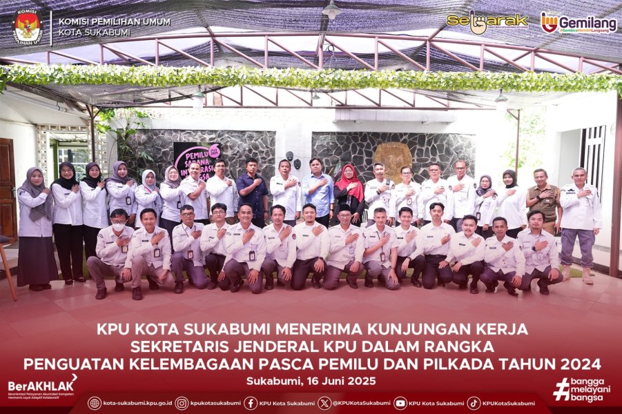 Sukabumi, Senin 16 Juni 2025 — Komisi Pemilihan Umum (KPU) Kota Sukabumi hari ini menerima kunjungan kerja dari Sekretaris Jenderal (Sekjen) KPU RI, Bernad Dermawan Sutrisno, beserta jajaran. Kunjungan ini dilaksanakan dalam rangka Penguatan Kelembagaan Pasca Pemilu dan Pilkada Tahun 2024, sebagai bagian dari upaya konsolidasi organisasi dan evaluasi pelaksanaan tugas-tugas kesekretariatan pasca tahapan pemilu dan pilkada.
