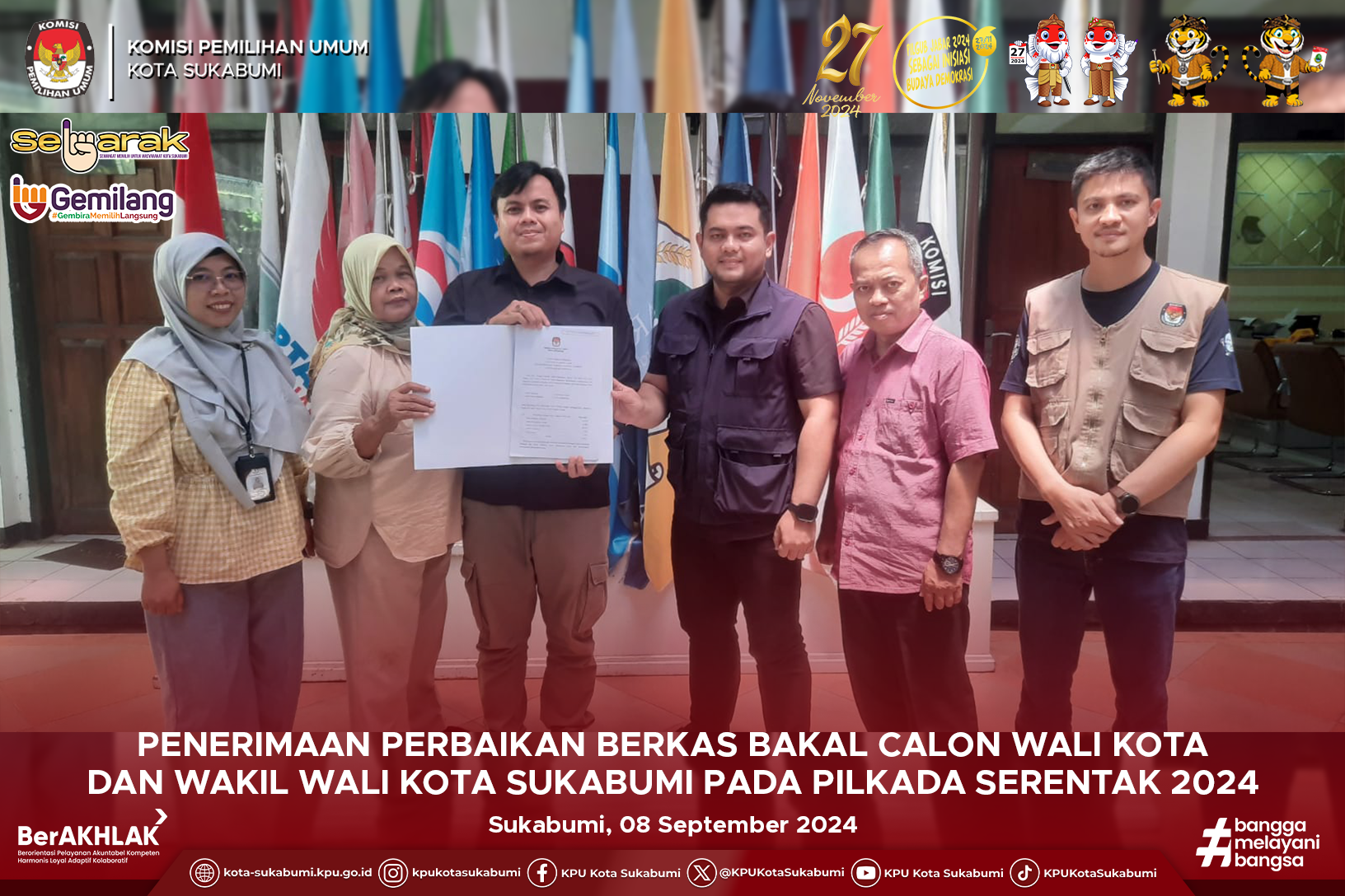 Sukabumi, 08 September 2024 — Komisi Pemilihan Umum (KPU) Kota Sukabumi telah menyelesaikan proses penerimaan perbaikan berkas bakal calon Wali Kota dan Wakil Wali Kota untuk Pilkada Serentak 2024. Kegiatan ini berlangsung di Kantor KPU Kota Sukabumi mulai tanggal 6 hingga 8 September 2024, dengan sejumlah pasangan bakal calon menyerahkan perbaikan dokumen pencalonan mereka.