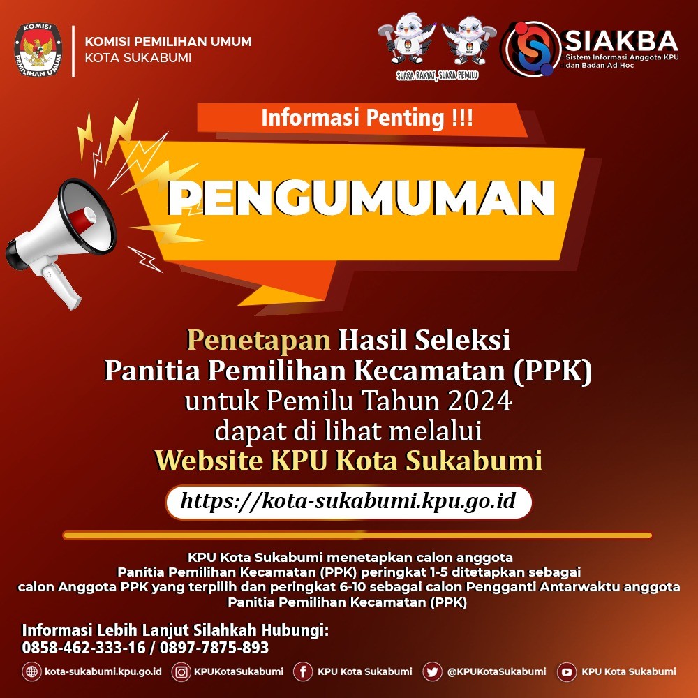 - KPU Kota Sukabumi menetapkan calon anggota Panitia Pemilihan Kecamatan peringkat 1-5 ditetapkan sebagai calon Anggota Panitia Pemilihan Kecamatan yang terpilih dan calon anggota Panitia Pemilihan Kecamatan peringkat 6-10 sebagai calon Pengganti Antarwaktu anggota Panitia Pemilihan Kecamatan sebagaimana daftar terlampir.