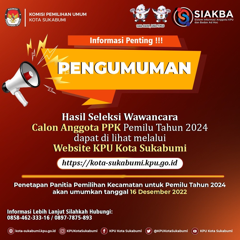 Berdasarkan Berita Acara Rapat Pleno KPU Kota Sukabumi Nomor: 090/PP.04.1-BA/3272/2022 Tanggal 14 Desember 2022 tentang Rapat Pleno Penetapan Hasil Seleksi Wawancara Panitia Pemilihan Kecamatan untuk Pemilu Tahun 2024, disampaikan hal-hal sebagai berikut :