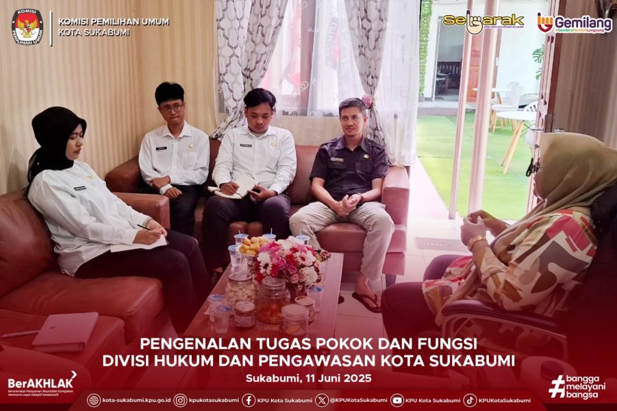 Sukabumi, 11 Juni 2025 — Komisi Pemilihan Umum (KPU) Kota Sukabumi melalui Divisi Hukum dan Pengawasan melaksanakan kegiatan Pengenalan Tugas Pokok dan Fungsi (Tupoksi) kepada sejumlah staf sekretariat, khususnya Calon Pegawai Negeri Sipil (CPNS) yang baru bergabung. Kegiatan ini bertujuan untuk memperkuat pemahaman kelembagaan serta meningkatkan kesiapan kerja di lingkungan sekretariat KPU Kota Sukabumi.