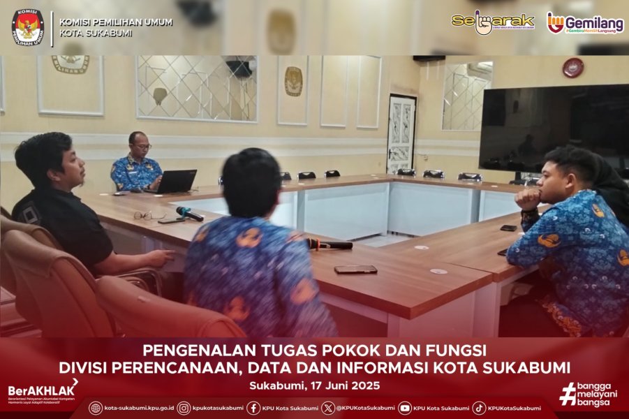 Selasa, 17 Juni 2025 — Komisi Pemilihan Umum (KPU) Kota Sukabumi melalui Divisi Perencanaan, Data, dan Informasi menggelar kegiatan pengenalan tugas pokok dan fungsi (tupoksi) kepada sejumlah staf sekretariat, khususnya Calon Pegawai Negeri Sipil (CPNS) yang baru bergabung.