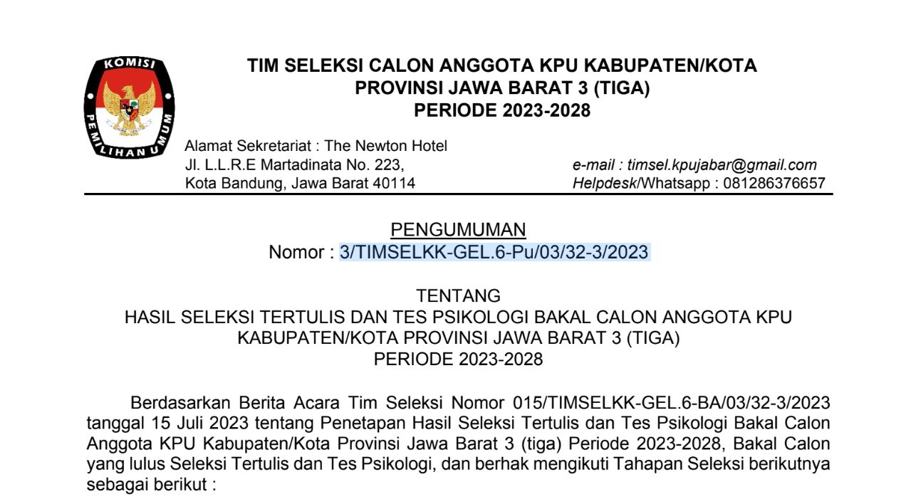 PENGUMUMAN HASIL SELEKSI TERTULIS DAN TES PSIKOLOGI BAKAL CALON ANGGOTA KPU KABUPATEN/KOTA PROVINSI JAWA BARAT 3 (TIGA) PERIODE 2023-2028