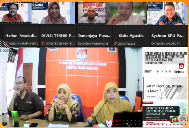 Sukabumi, 08 Oktober 2021 – Webinar BICARA (Bincang Cerdas Demokrasi) yang bertemakan “Peran Media dan Kehumasan dalam Pewujudkan Partisipasi Publik untuk Demokrasi yang Berintegritas” merupakan webinar kolaborasi antara KPU Kota Sukabumi, KPU Kabupaten Sumedang dan KPU Kabupaten Bogor. Pelaksanaan webinar dimulai pada pukul 13.00 s/d 16.00 WIB dengan jumlah peserta kurang lebih 100 orang.