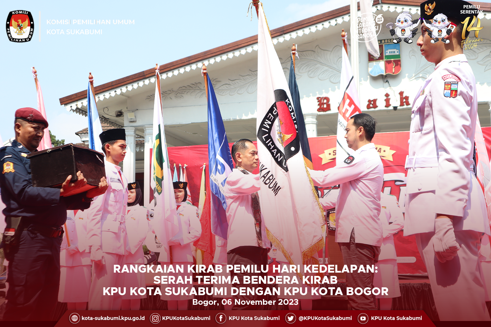 BOGOR, KPU Kota Sukabumi --- Hari ini Senin Tanggal 06 November 2023 bertempat di Balai Kota Bogor, dilangsungkan acara serah terima bendera kirab antara Komisi Pemilihan Umum (KPU) Kota Sukabumi dengan KPU Kota Bogor. Acara ini merupakan bagian dari rangkaian kirab hari kedelapan KPU Kota Sukabumi dan sekaligus menutup rangkaian kirab di Kota Sukabumi.